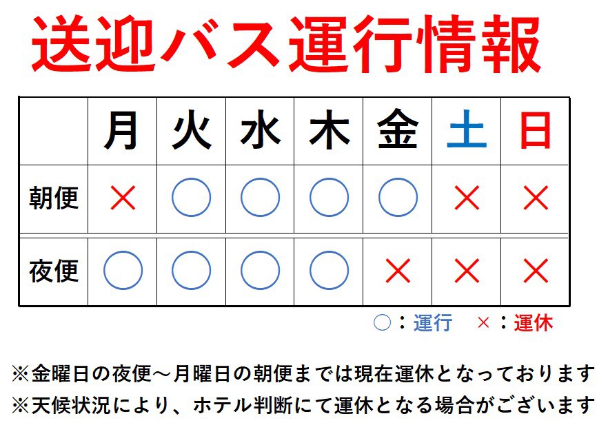 - 年末年始・GW・お盆その他ホテル都合により臨時運休する場合があります。