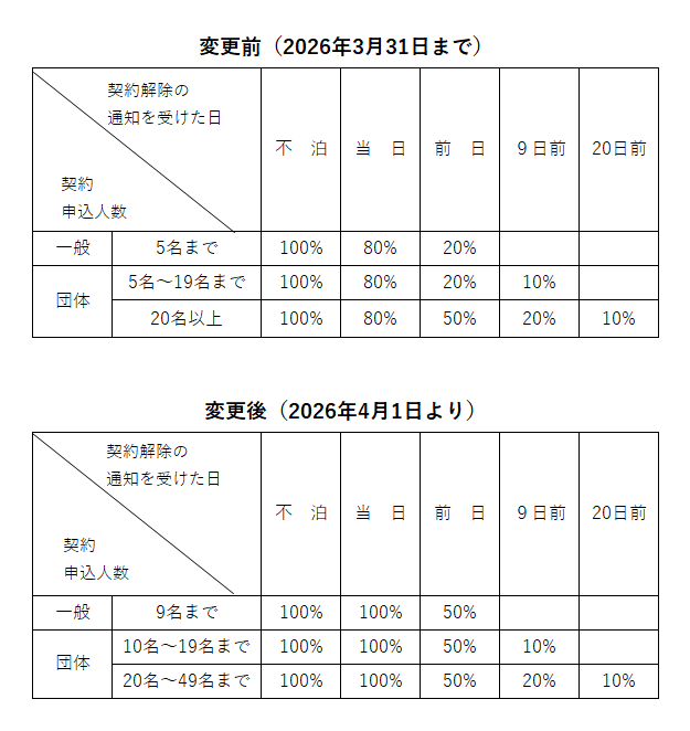 この度、2026 年4 月1 日(火)ご予約受付分より、キャンセル料金を改定させていただくこととなりました。
